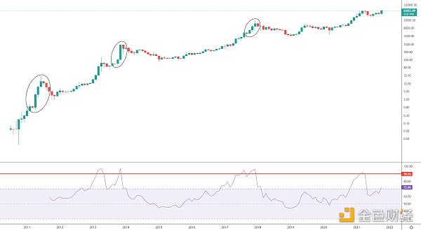 观察研究RSI走势,可以发现2013年和2017年牛市,每一轮牛市,随着价格一路向上,RSI都有拉升超过警戒线数值90上方两次的机会。