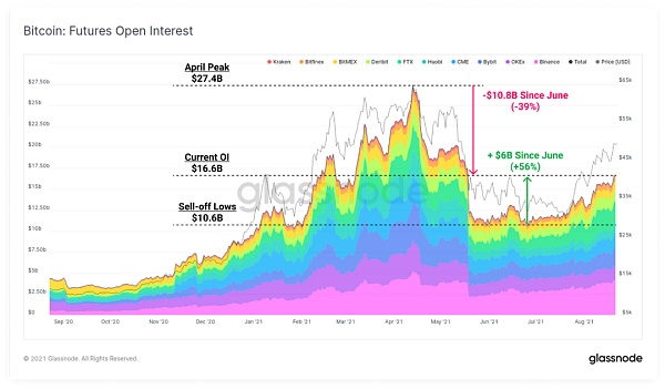 先看衍生品市场的变化。比特币期货的未平仓头寸与币价齐升。5月份,未平仓头寸从274亿美元急剧下跌至106亿美元,目前已经反弹到166亿美元。本周,随着交易者开始使用更多杠杆,期货合约的开仓量增加了10亿美元。
