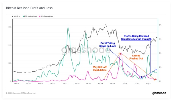 已实现市值HODL波浪图为当前链上支出行为提供了证据,整个8月份,小于1个月币龄的占比正在膨胀,这表明部分长期筹码已被花费并换手到新的持有者手中。该指标的增长幅度与2020年积累阶段一致。这表明,虽然有部分长期筹码被套现了,但仍然在市场可以吸收的范围之内。?