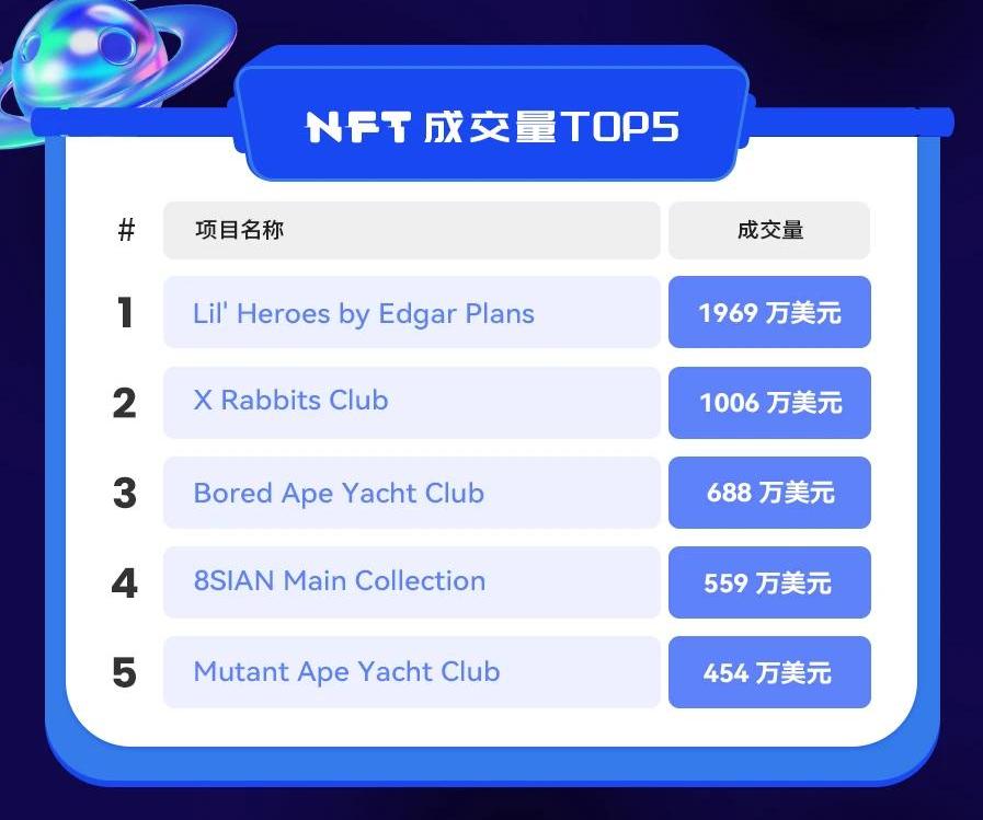 按过去24小时成交量,排名前五的项目分别为Lil'HeroesbyEdgarPlans、XRabbitsClub、BoredApeYachtClub、8SIANMainCollection和MutantApeYachtClub。