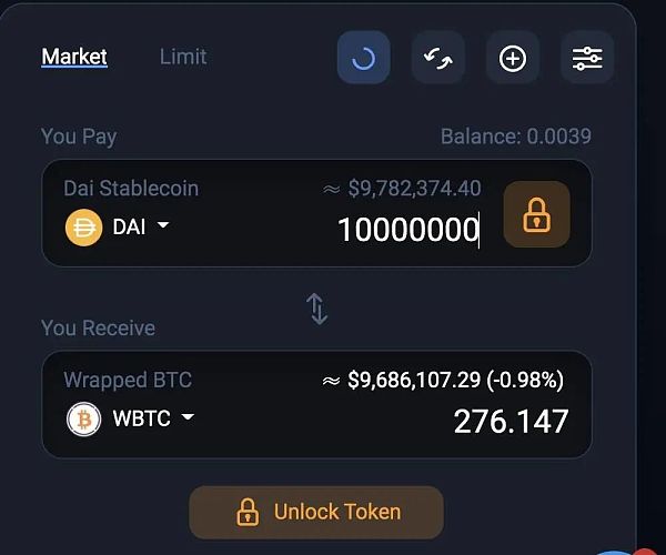 比如我想要用DAI稳定币购买wBTC,交易金额为1000万美元,那么显示可获得的wBTC数量大约为282.06 BTC。