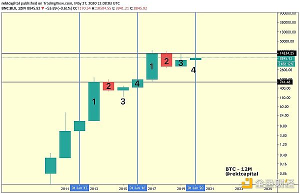 就目前而言,我们现在应该处于比特币四年周期中的第四个阶段,也在第一阶段之前,这意味着2021年将会是迎来比特币下一阶段的第一年。从这个角度来看,特币12个月烛台收盘价格需要在2020年底突破14,300美元点位。
