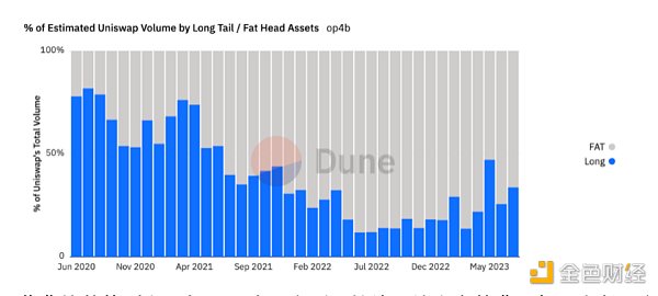 下图显示了自2020年6月以来Uniswap的月交易量,按长尾和fat head分别来看。任一主要L1、L2和稳定币对是fat head。随着时间的推移,很明显有越来越多的Uniswap交易量来自fat head交易对。